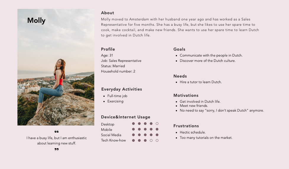 As an expat in the Netherlands and with a hectic schedule, Molly wants to find a high-rating Dutch tutor who can fit her availability for lectures and book an appointment to check everything before starting the course so that she can use her spare time to learn Dutch and get more involved into the Dutch culture.